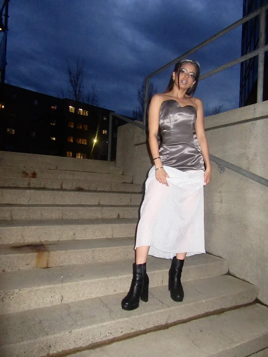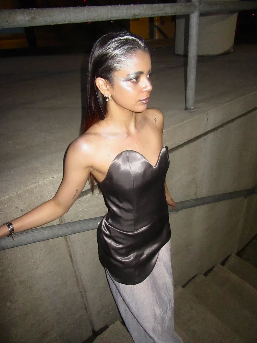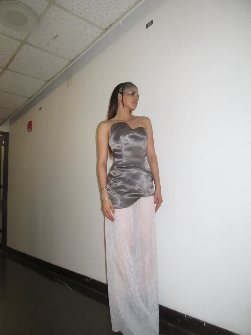 i have gravitated toward silver my whole life and have recently found myself incorporating hardware and metal more and more into my projects, inspiring me to lean into the properties and movements of melting silver in this project. consists of an asymmetrical boned bodice with a hand-pricked zipper and a matching skirt with a sheer underskirt layer. featured in DON magazine’s spring 2025 issue and at the 2025 MassArt All-School Show.