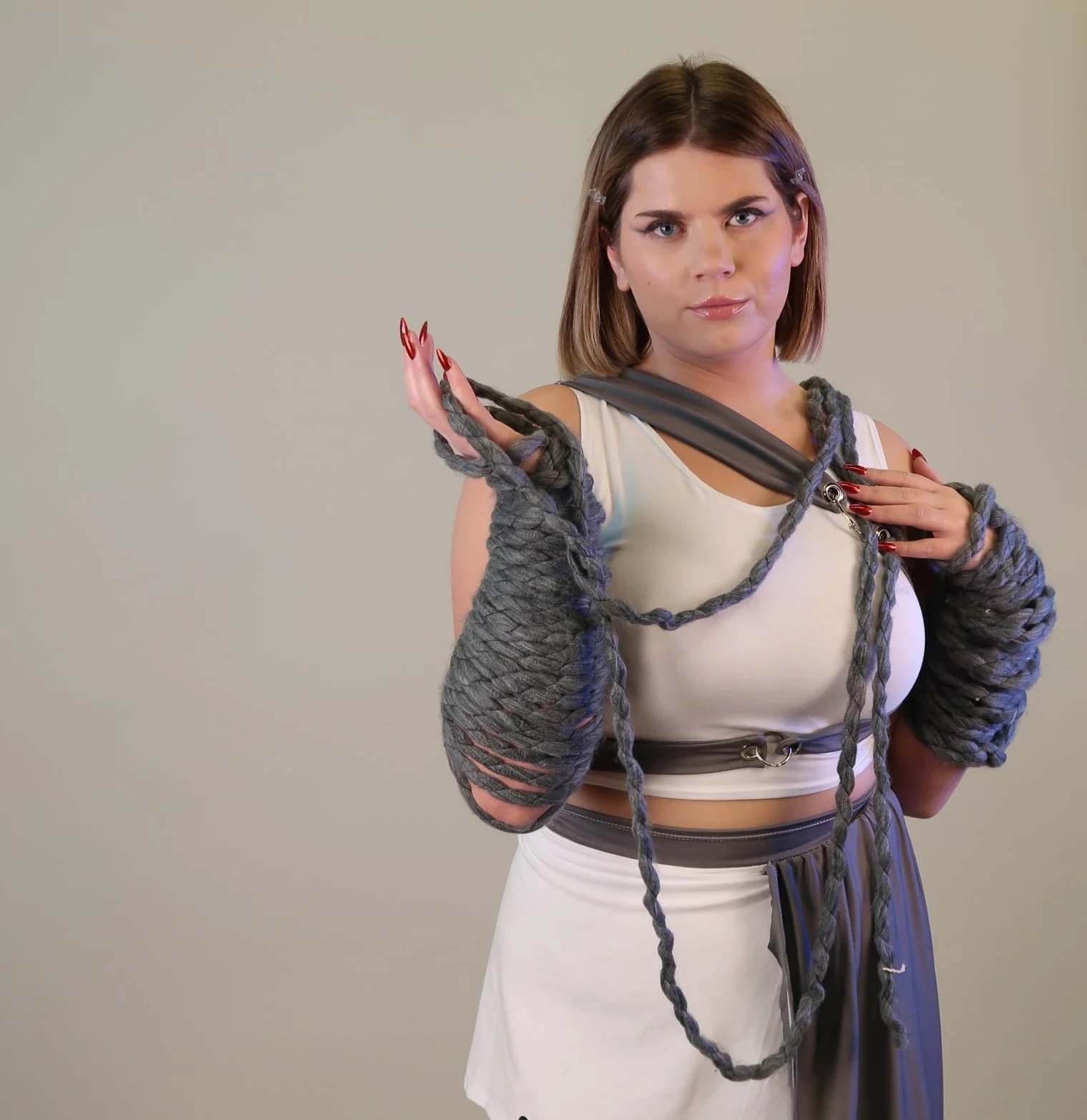 a knitwear collection and ensemble driven by the contrast between soft and hard, both in fabric and in material, and exploring having an element on a garment that can pull across the body and create different style combinations.
